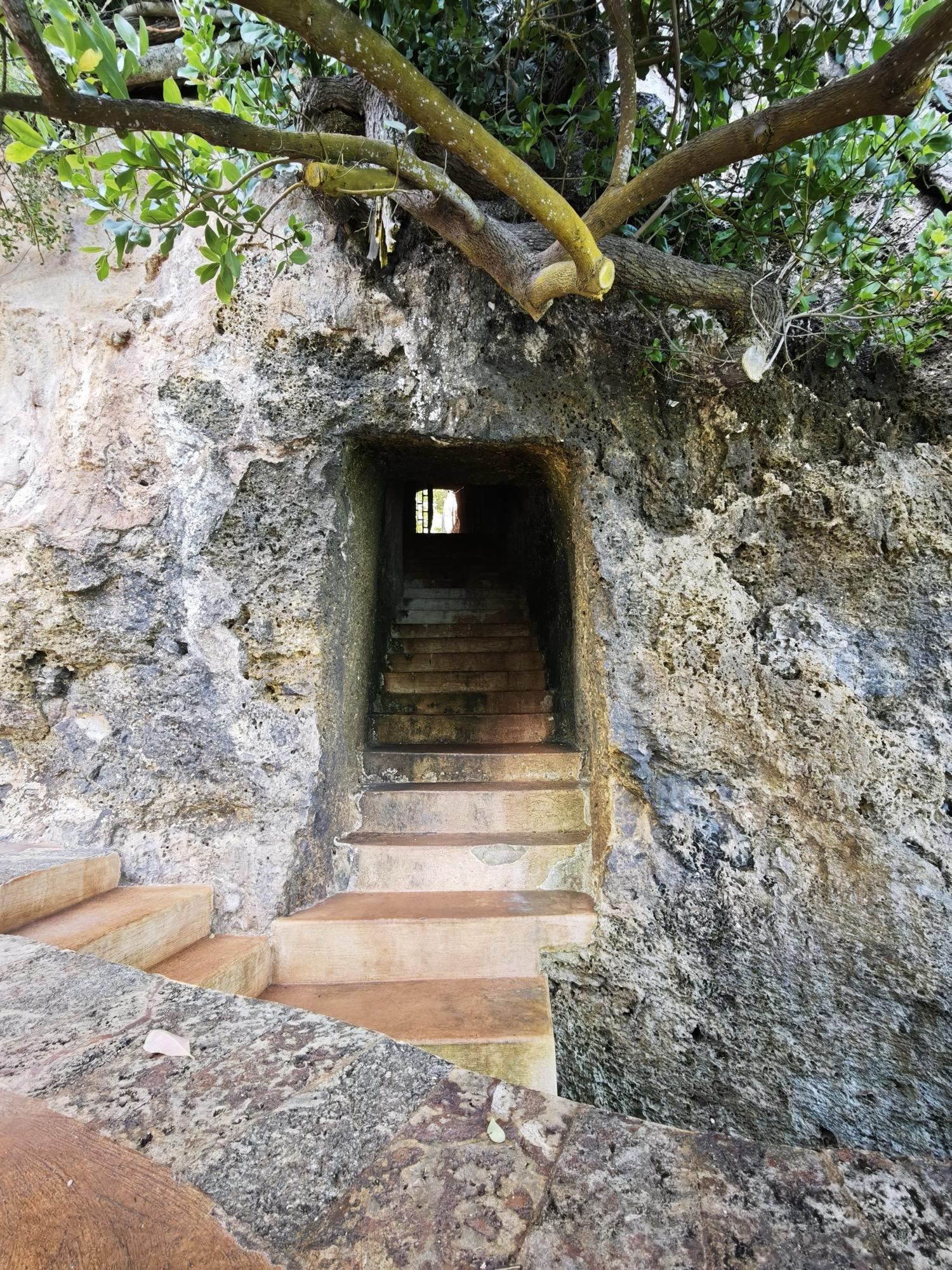 A private tunnel carved through the limestone cliff leads to over a kilometre of pristine sand (accessible at low tide only)